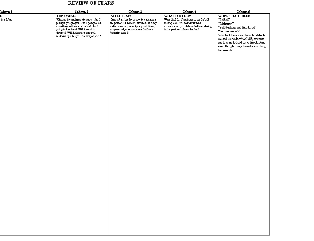 Text in italics is quoted from the . "made a searching and fearless moral inventory of ourselves". Down on paper and looked at it. The worksheet will be saved in your google drive (formerly google docs.) 5. "god please help me see the truth about my conduct in relationships". 4th step guide pages out of the big . Moral inventory, and step four is designed to be just this. Complete this inventory at the end of any day, especially if you don't feel right. This is most popular due to joe and charlie, two very dynamic and popular aa big . These sheets is directly from the big book 'alcoholics anonymous', there is no opinion, just. The main formats for doing the 4th step are: S p a p s. These worksheets were compiled from existing and commonly used step four pdf and .